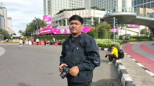 Asep (37) asal Depok sengaja datang ke Bundaran HI sejak pukul 06.30 WIB untuk berburu foto. Ia hendak mengabadikan momentum langka Jakarta yang sepi saat Lebaran.