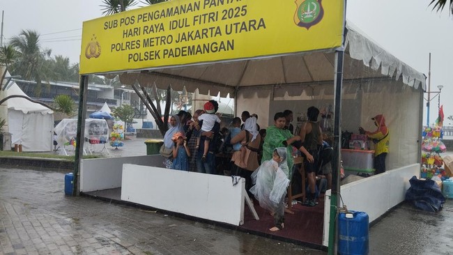 Hujan deras mengguyur kawasan Jakarta Utara (Jakut) siang ini. Warga yang tengah berlibur ke Pantai Ancol saat momen libur Lebaran 2025 pun berhamburan berteduh.
