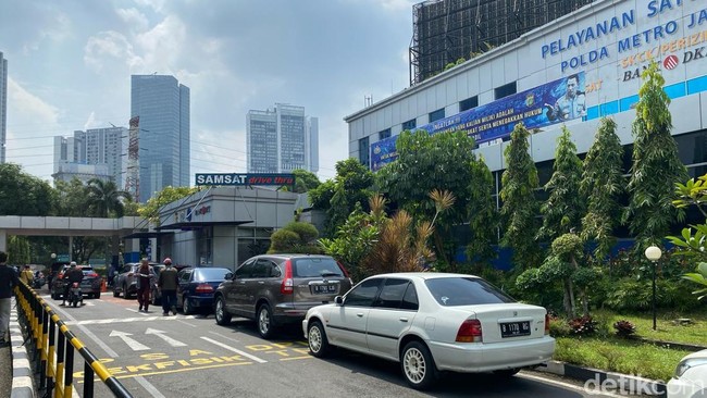 Pantauan detikcom, Selasa (8/4/2025) di Samsat Jakarta Selatan di Mapolda Metro Jaya, antrean terlihat di layanan drive thru. Kendaraan roda empat mengular hingga gedung Balai Pertemuan Metro Jaya (BPMJ).