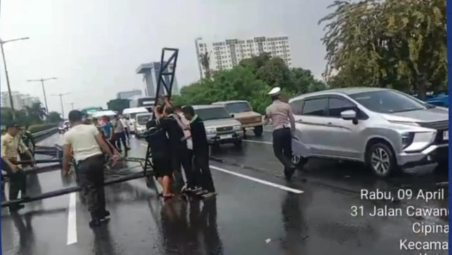 "15.26 Evakuasi papan reklame di Ruas Tol Dalam Kota KM 0.600 dari arah Pancoran menuju Cawang, situasi arus lalu lintas menjelang lokasi padat," tulis akun X TMC Polda Metro Jaya, dikutip, Rabu (9/4/2025).