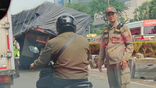Dari pantauan detikcom, Kamis (10/4/2025) pukul 09.41 WIB, truk yang mengalami patah as berada di jalur arteri. Namun posisinya miring ke kanan yang menyebabkan separator busway berantakan.