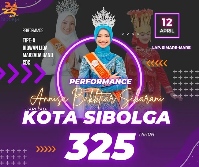 Sebagai informasi, Kota Sibolga lahir pada 2 April 1700. Adapun perayaan HUT Sibolga tahun ini mengambil tema 'Kolaborasi yang Tepat untuk Sibolga Super'. Tak hanya Annisa, puncak Hari Jadi Kota Sibolga ke-325 juga akan dimeriahkan musisi kenamaan Tanah Air, sebut saja Tipe-X, Ridwan LIDA, hingga Marsada Band.