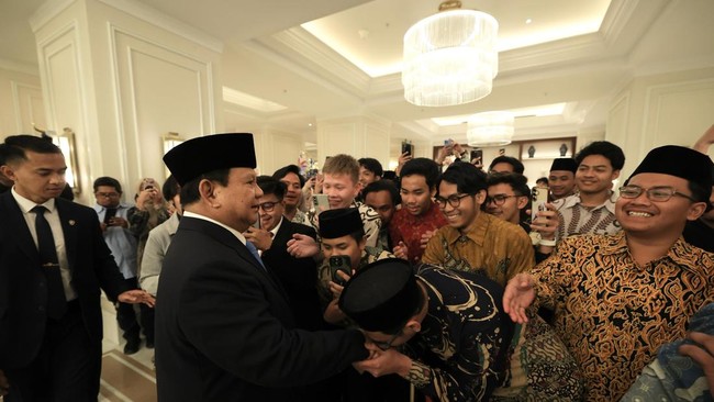 Sejumlah mahasiswa menyambut kedatangan Presiden Prabowo. Mereka antusias bertemu dan bersalaman dengan Prabowo secara langsung.