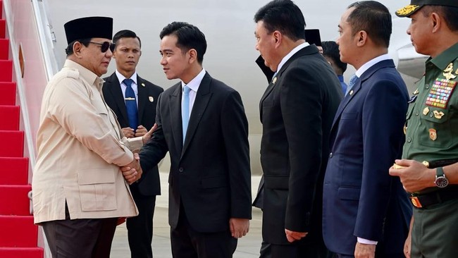 Dikutip Biro Sekretariat Presiden, Prabowo tiba di Pangkalan TNI AU Halim Perdanakusuma, Selasa (15/4/2025) pukul 07.35 WIB. Ketibaan Prabowo disambut Wakil Presiden Gibran Rakabuming, Menteri Koordinator bidang Politik dan Keamanan Budi Gunawan, Menteri Sekretaris Negara Prasetyo Hadi, Panglima TNI Jenderal Agus Subiyanto, dan Kapolri Jenderal Listyo Sigit Prabowo.
