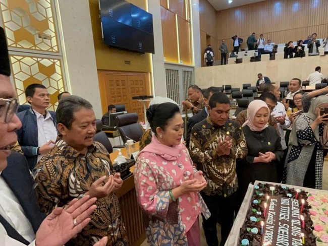 Momen kejutan ulang tahun itu terjadi di ruang rapat Komisi IV DPR, kompleks parlemen Senayan, Jakarta Pusat, Selasa (22/4/2025). Titiek terlihat mengenakan batik berwarna merah muda.