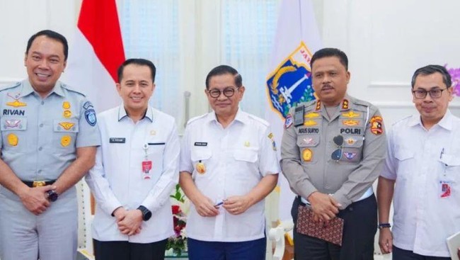 Kepala Korps Lalu Lintas (Kakorlantas) Polri Irjen Agus Suryonugroho mengikuti rapat bareng Gubernur Jakarta Pramono Anung di Balai Kota DKI Jakarta. Rapat tersebut membahas mengenai pajak kendaraan bermotor di Jakarta.