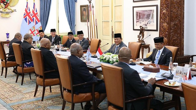 Presiden Indonesia Prabowo Subianto melakukan pertemuan dengan Perdana Menteri Republik Fiji Sitiveni Rabuka di Istana Merdeka. Prabowo didampingi menteri Kabinet Merah Putih dalam pertemuan yang membahas hubungan bilateral kedua negara.