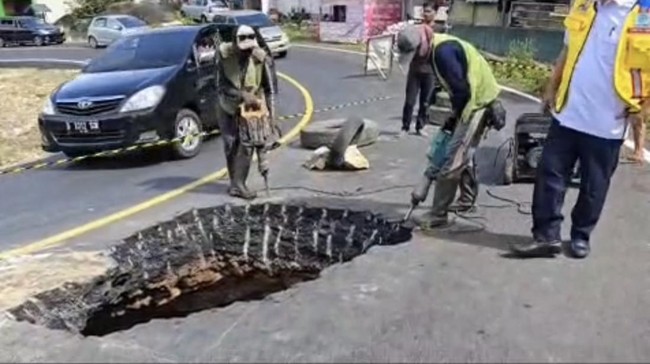 Sebuah lubang atau sinkhole muncul di ruas Jalan Poros Maros-Bone dekat wilayah Camba atau Kappang, Kabupaten Maros, Sulawesi Selatan (Sulsel). Pengendara diimbau untuk mencari jalur alternatif.