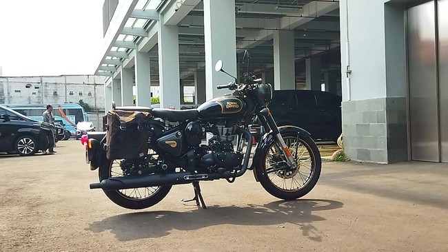 Pantauan detikcom, Jumat (25/4/2025), moge tersebut berwarna hitam. Terdapat tulisan 'Royal Enfield' berwarna kuning pada bagian tangki bensin yang merupakan merek dari motor tersebut.