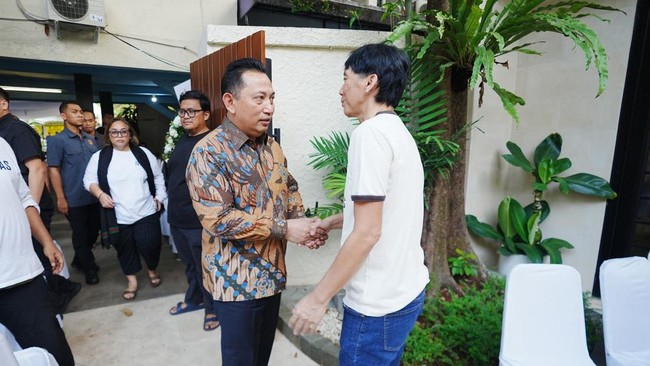 Jenderal Sigit tiba di rumah duka Jalan Potlot 3 Pancoran, Jakarta Selatan, Minggu (27/4/2025) sekitar pukul 16.30 WIB. Kedatangannya disambut langsung Bimbim Slank dan istri serta keluarga almarhumah bunda Iffet.