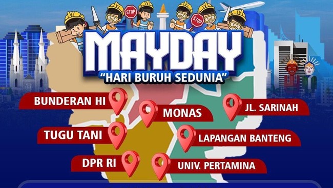 Massa buruh akan melakukan aksi demonstrasi untuk memperingati Hari Buruh atau May Day yang dipusatkan di Monas, Jakarta Pusat, pada 1 Mei 2025 besok. Polisi mengimbau pengendara untuk menghindari beberapa ruas jalan.