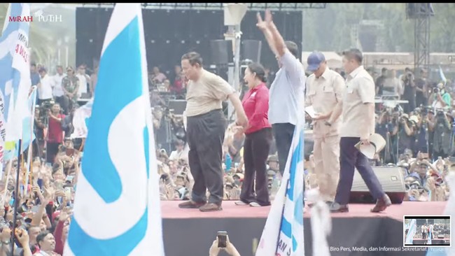 Setelah itu dia berjalan kembali ke arah panggung. Pada saat itu, Ketua DPR RI Puan Maharani tampak meminta Prabowo berfoto bersamanya. Para pimpinan serikat buruh juga terlihat ikut berfoto bersama Puan dan Prabowo.