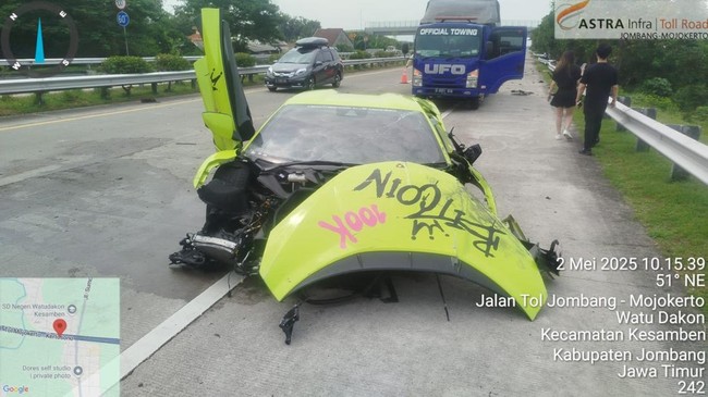 Supercar Lamborghini Revuelto bernopol D-1675-QGK terlibat kecelakaan di Km 697-B Tol Jombang-Mojokerto (Jomo). Mobil mewah ini menabrak mobil Suzuki Ignis dan besi pembatas jalan.