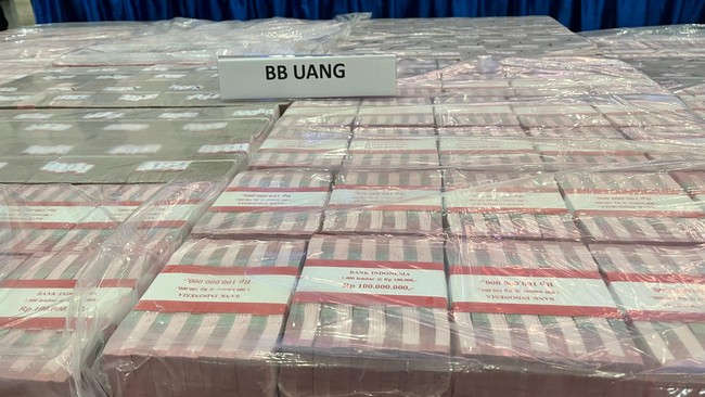 Uang tunai itu ditempatkan dalam plastik bening. Tampak ada 35 plastik berisi gepokan duit pecahan Rp 100 ribu dan 80 plastik berisi gepokan duit pecahan Rp 50 ribu.