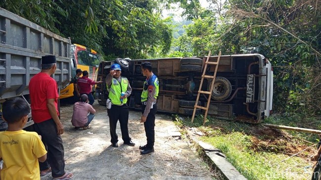 Adapun bus yang pertama itu tidak sampai terguling, namun posisinya miring tertahan galengan atau tanggul jalan. "Di mana bus ini milik pondok yang biasa untuk antar jemput santri ke sekolah," imbuhnya.
