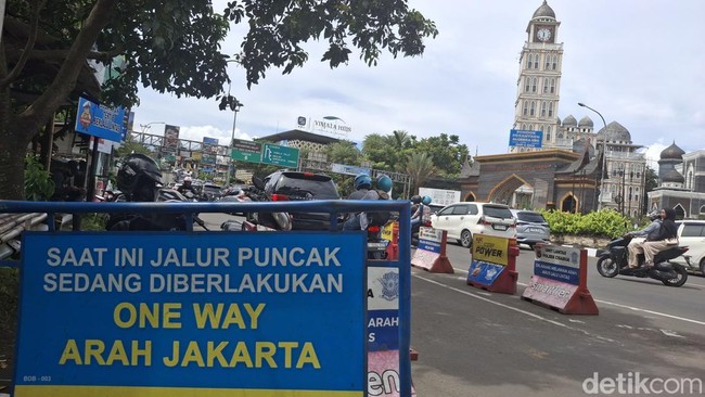 Pantauan detikcom pukul 12.00 WIB, arus lalu lintas di Jl Raya Puncak berlaku satu arah menuju Jakarta. Sedangkan arus kendaraan menuju kawasan Puncak disetop sementara.