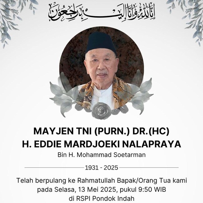 Mantan Wakil Gubernur (Wagub) Jakarta, Mayjen (Purn) Eddie Mardjoeki Nalapraya, meninggal dunia. Eddie Nalapraya, yang merupakan tokoh Betawi, juga dikenal sebagai Bapak Pencak Silat Dunia.