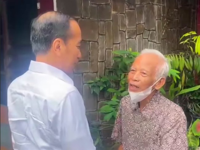 Dalam video yang diunggah, Jokowi tampak bertemu dengan Kasmudjo, yang menyambut bersama istrinya. Jokowi terlihat sempat mencium tangan Kasmudjo.