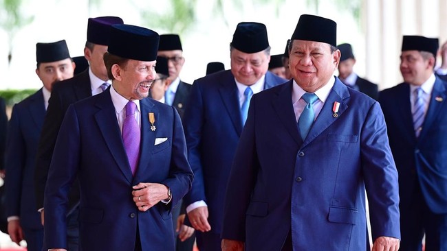 Presiden Prabowo Subianto disambut hangat Sultan Brunei Darussalam Haji Hassanal Bolkiah di Istana Nurul Iman. Prabowo berterima kasih atas penyambutan istimewa yang diterimanya.
