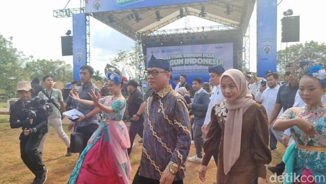 Menteri Desa dan Pembangunan Daerah Tertinggal (Mendes PDT) Yandri Susanto menghadiri Festival Gerakan Desa Peduli Sampah di Alun-alun Cikande, Serang, Banten. Yandri disambut tarian khas Banten, Tari Rampak Bedug.