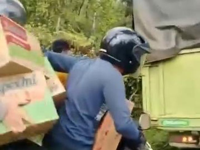 Dalam video yang dilihat, tampak warga menjarah atau mengambil mi instan muatan truk tersebut. Sejumlah mi instan dalam kardus diambil dan dipindahkan warga ke kendaraan roda dua mereka.