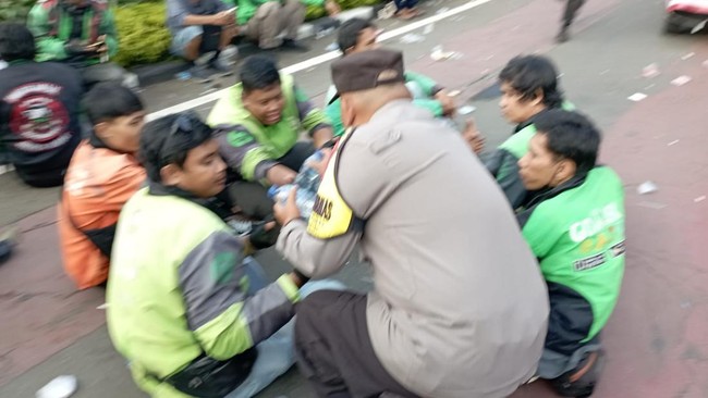 Personel kepolisian mengedepankan pendekatan humanis dalam pengamanan demo ojol di Patung Kuda, Jakarta Pusat. Tak hanya melaksanakan pengamanan terhadap massa aksi, polisi juga melakukan aksi humanis dengan membagi-bagikan minuman kepada para ojol.
