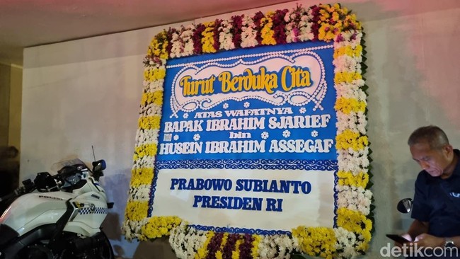 Presiden Prabowo Subianto mengirimkan karangan bunga dukacita untuk almarhum suami jurnalis Najwa Shihab, Ibrahim Assegaf. Karangan bunga dari Prabowo terlihat tepat di depan rumah duka.
