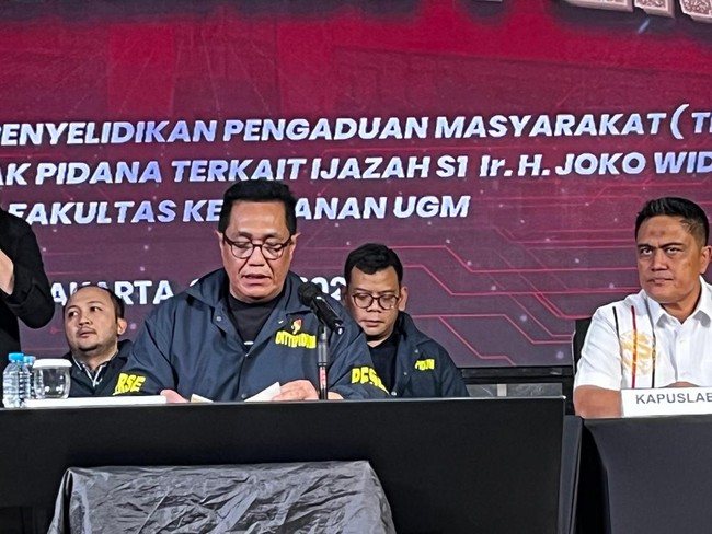 "Adanya surat keterangan lulus ujian praktik atas nama Joko Widodo pada tahun 1984 yang diarsipkan oleh Fakultas Kehutanan UGM," kata Dirtipidum Bareskrim Polri Brigjen Djuhandhani Rahardjo Puro konferensi pers, Kamis (22/5/2025).