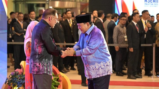 Presiden Prabowo Subianto menghadiri gala dinner dalam rangka Konferensi Tingkat Tinggi (KTT) ke-46 ASEAN yang diselenggarakan Perdana Menteri (PM) Malaysia Anwar Ibrahim. Prabowo mengenakan batik bernuansa biru dalam acara tersebut.