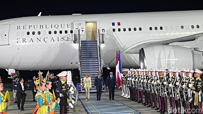 Presiden Prancis Emmanuel Macron bersama sang istri Brigitte Macron telah tiba di Indonesia. Ketibaan Macron dan istri disambut Menteri Pertahanan Sjafrie Sjamsoeddin.