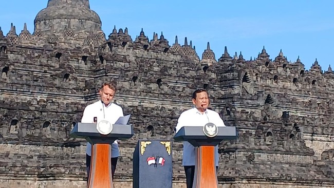 Hal tersebut disampaikan dalam joint statement bersama Presiden Prancis Emmanuel Macron di Candi Borobudur Magelang, Jawa Tengah, Kamis (29/5). Turut hadir istri Presiden Macron, Brigitte Macron, hingga sejumlah pejabat negara di lokasi.