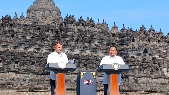 "Candi Borobudur, selain dipakai sebagai tempat ibadah, juga adikarya spiritual arsitektur yang merupakan bukti keunggulan peradaban Indonesia," ujar Macron dalam joint statement dengan Presiden RI Prabowo Subianto di Candi Borobudur, Magelang, Jateng, Kamis (29/5/2025).