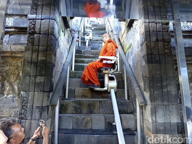 Tanto mengaku terbantu dengan fasilitas stairlift untuk bisa naik ke atas Borobudur. Dia mengaku berharap fasilitas itu bisa dipermanenkan.