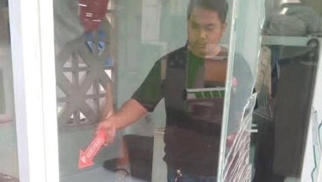 Berdasarkan foto yang lainnya, tampak sejumlah kepolisian sedang melakukan olah tempat kejadian perkara (TKP) di lokasi kejadian. Polisi menunjukkan bagian kaca keamanan yang hancur hingga berlubang.