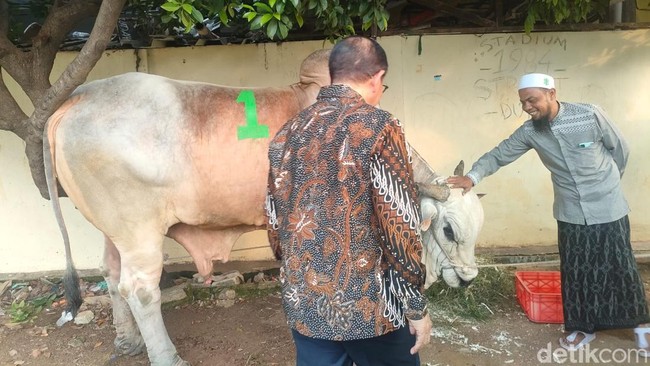 Gubernur Jakarta Pramono Anung berkurban sapi seberat 1,1 ton di Tambora, Jakarta Barat. Pramono berharap kurban daging yang diberikan dapat bermanfaat bagi warga sekitar.