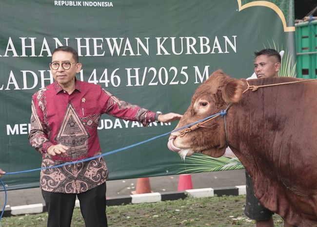 Menteri Kebudayaan Fadli Zon memimpin penyerahan hewan kurban secara simbolis di Kantor Pusat Kementerian Kebudayaan, Jakarta. Hal ini menjadi penanda pelaksanaan kurban perdana yang diprakarsai oleh seluruh unit utama, satuan kerja, dan UPT Kementerian Kebudayaan yang berada di wilayah Jakarta.