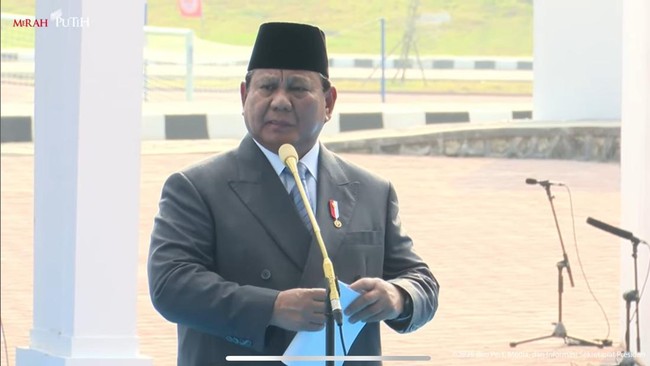 Presiden Prabowo Subianto berkelakar saat menyapa tamu yang hadir dalam peresmian Kampus Bhinneka Tunggal Ika, Universitas Pertahanan (Unhan). Prabowo mengatakan seharusnya menyapa Kapolri terlebih dahulu, barulah kemudian Panglima TNI.