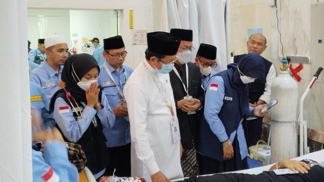 Menteri Agama (Menag) Nasaruddin Umar menjenguk jemaah haji Indonesia yang dirawat di Klinik Kesehatan Haji Indonesia (KKHI) Makkah. Nasaruddin mendoakan jemaah yang dirawat di KKHI Makkah segera pulih dan bisa kembali ke hotel.
