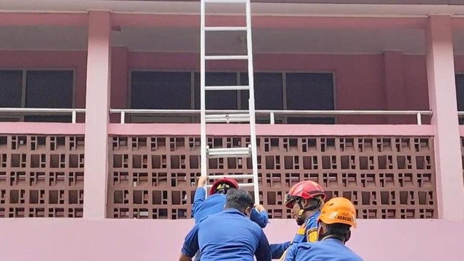 Petugas damkar naik ke genteng menggunakan tangga yang telah dibawa. Evakuasi dilakukan selama satu jam.