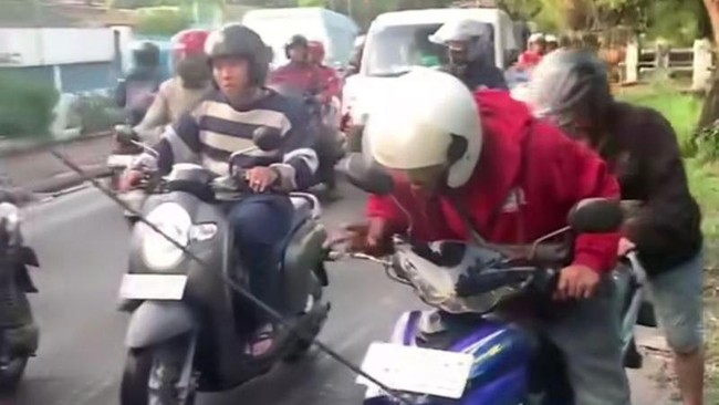 Dua orang yang berboncengan tersebut mengalami luka-luka pada beberapa bagian tubuh. Pria dewasa yang mengendarai sepeda motor tampak mengalami luka pada bagian dagu, sementara pria lain yang diboncengkan terluka pada jari kakinya.