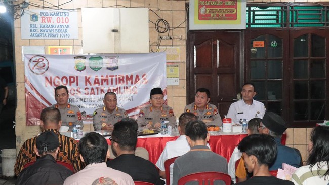 Polda Metro Jaya menggelar Ngopi Kamtibmas bersama masyarakat di wilayah Karang Anyar, Sawah Besar, Jakarta Pusat (Jakpus). Polisi mengajak masyarakat untuk sama-sama menjaga keamanan dan ketertiban.