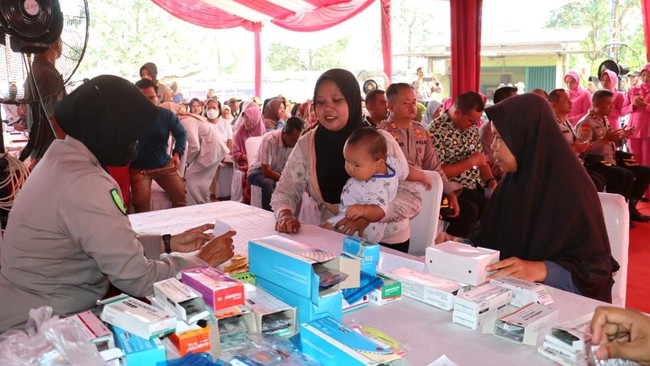 Polres Metro Depok menggelar kegiatan bakti sosial dan bakti kesehatan di sekitar TPA Cipayung, Depok. Kegiatan itu dalam rangka menyambut Hari Bhayangkara ke-79.