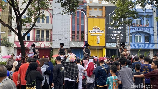 Tampak ada juga warga melalukan swafoto di lokasi. Anak-anak juga terlihat naik kuda didampingi Polwan sembari mengabadikan momen tersebut.