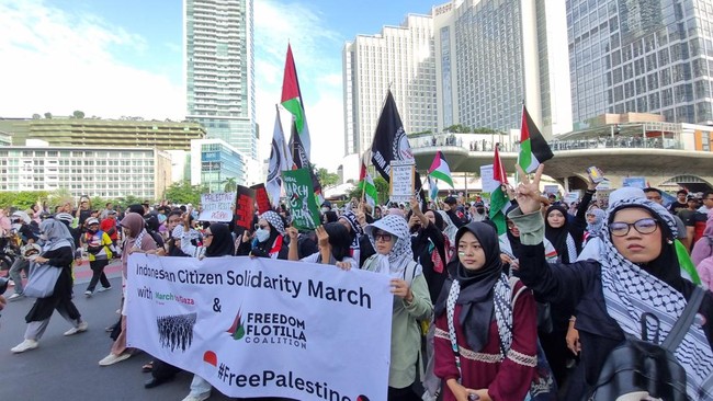 "Indonesian citizen solidarity march with march to Gaza and freedom flotilla coalition," tulis spanduk tersebut.