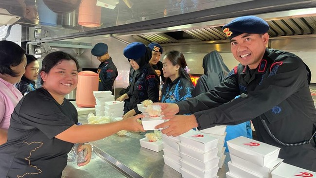 Dalam rangka HUT ke-79 Bhayangkara, Direktorat Samapta Polda Metro Jaya juga menggelar dapur umum di CFD Bundaran HI, Jakarta Pusat. Total ada sebanyak 500 porsi makan bergizi yang dibagikan untuk masyarakat.