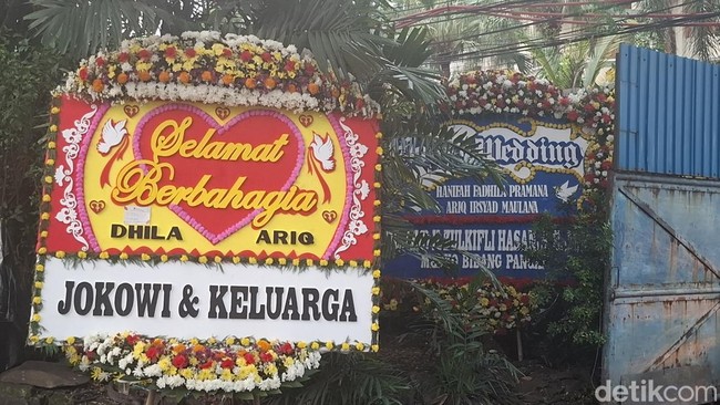 Karangan bunga ucapan selamat atas pernikahan Dhila dan Ariq juga dikirimkan Jokowi. Karangan bunga tiba di lokasi sekitar pukul 17.56 WIB.