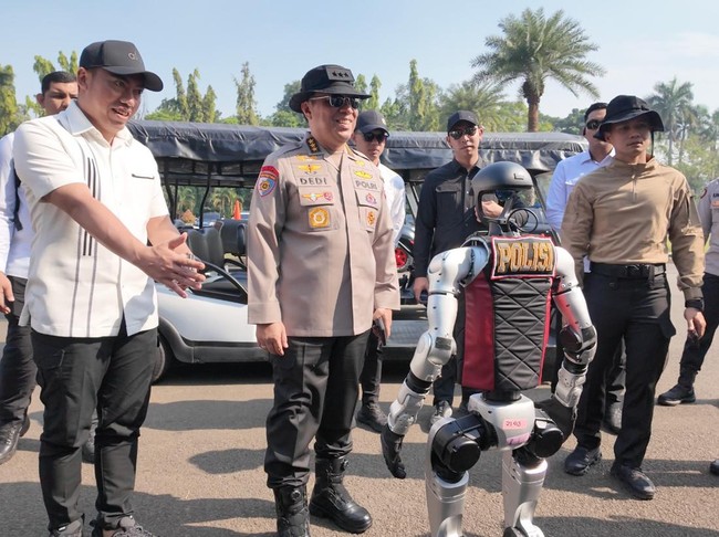 Robot tersebut berlari, baris-berbaris hingga memberikan sikap hormat lengkap dengan mengenakan atribut topi baret dan rompi Polri. Nampak sejumlah polisi mengoperasikan remote control di belakang masing-masing robot.