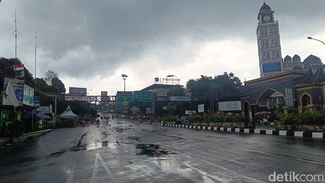Lalu lintas di Simpang Gadog tampak ramai lancar. Cuaca di Simpang Gadog dan sebagian kawasan Puncak terpantau hujan.