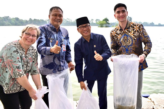 Kemudian Yandri, Verrel, Wakil Bupati Karawang Maslani dan tamu melepaskan bibit ikan nila ke Situ Cipule.