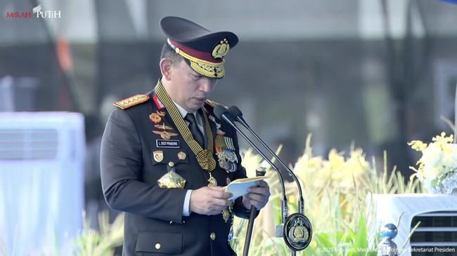 Hal itu disampaikan dalam sambutannya di Hari Bhayangkara ke-79 di Monas, Jakarta Pusat, Selasa (1/7/2025). Kapolri semula menyampaikan rasa bangga atas kehadiran Presiden Prabowo Subianto di tengah padatnya tugas kenegaraan.